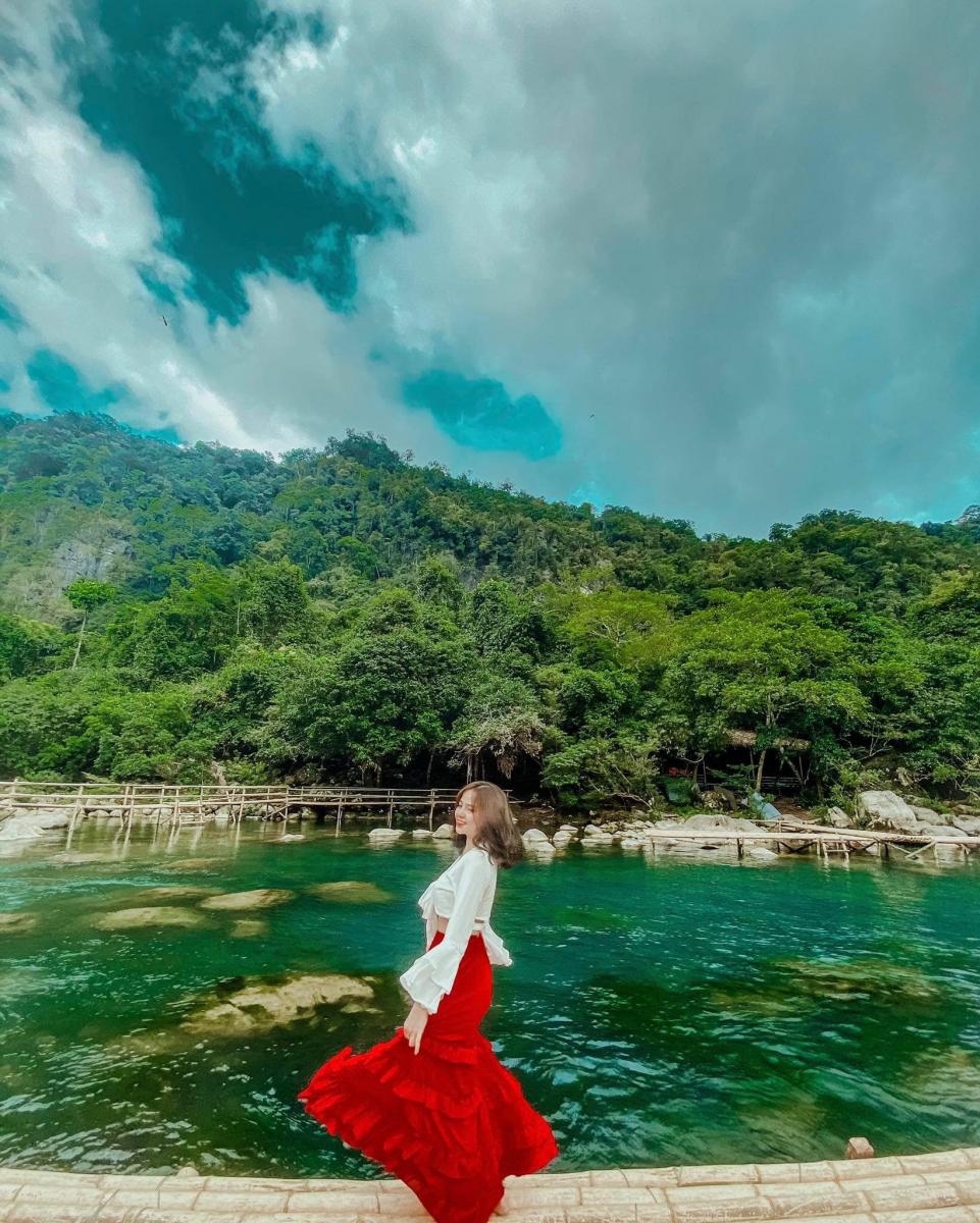 Vì là khu du lịch sinh thái, màu sắc chủ đạo tại Suối Moọc đương nhiên là màu xanh: sắc xanh của bầu trời, của cây lá, của dòng suối. Nếu bạn không có một NAG chuyên nghiệp “hộ tống”, cũng không đủ tự tin vào nhan sắc nghịch thiên của mình thì nên tránh tuyệt đối các sắc xanh, thay vào đó là những màu sắc rực rỡ như đỏ, vàng, trắng. Nếu đầu tư thêm những trang phục mang phong cách boho/ vintage thì càng tuyệt, đảm bảo bạn sẽ nổi bần bật và lung linh trong mọi khung hình.